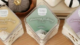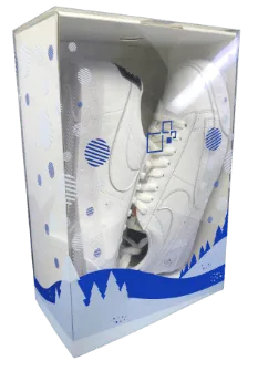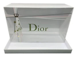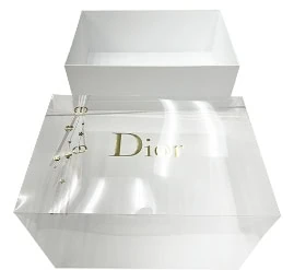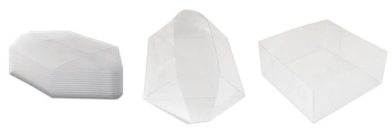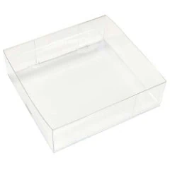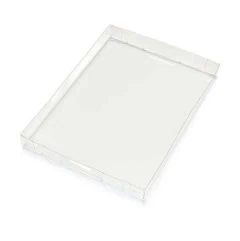 This clear box lid style is often used for cosmetic gift sets. Below we have a popular candle brand that features a non-glued lid/dust cover. This style works with setup boxes, rigid boxes, and other base types such as SBS and cardboard boxes. Decorating the clear lid with foil stamping along with translucent and opaque printing can really create a beautiful package for your brand. It does not need gluing, is shipped flat, and slides into the base box. This PET clear lid can be stored completely flat until assembled.
